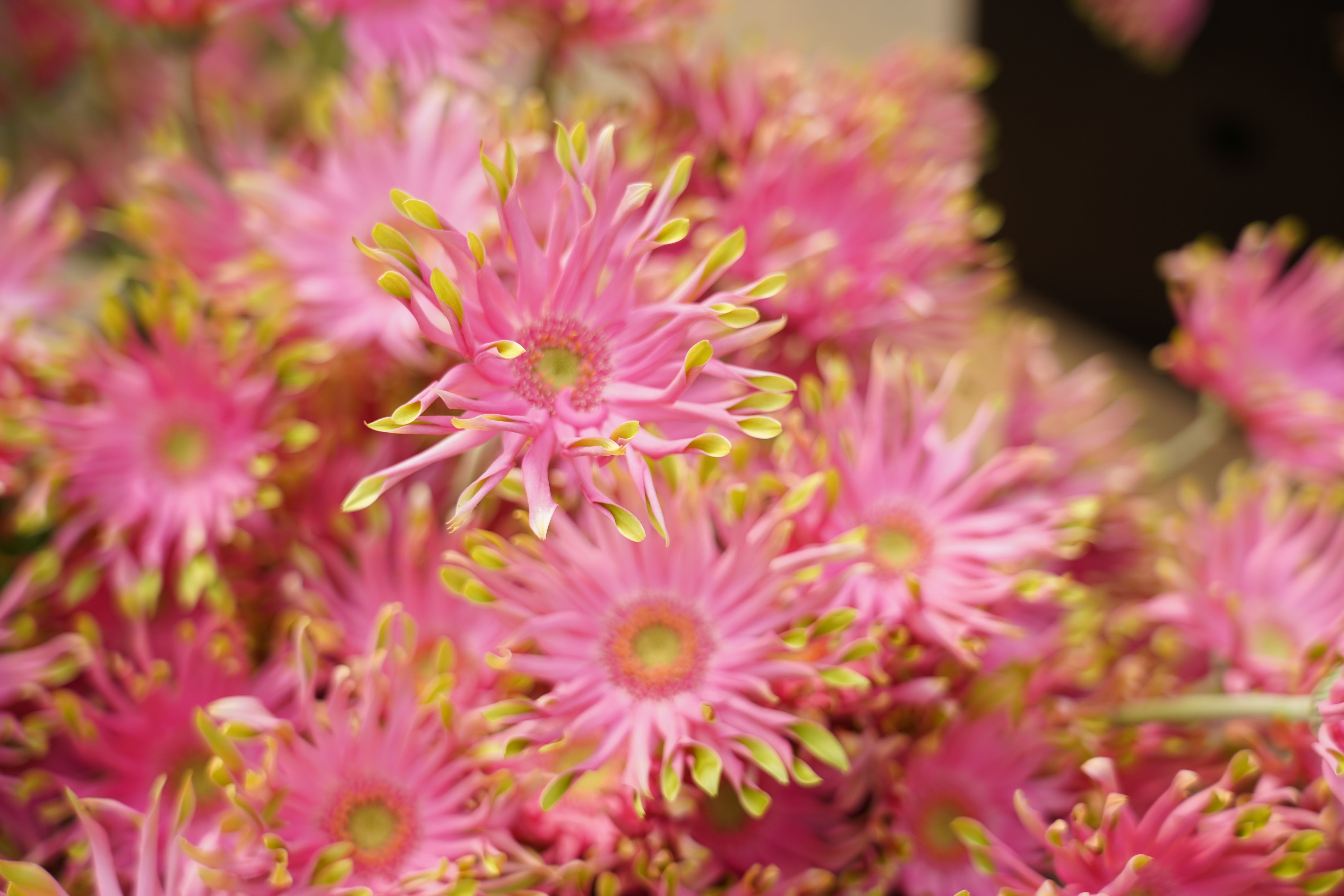 “非洲菊一期项目占地20000平米,温室采用了很多先进的设备,比如斯文森的内外遮阳幕布以及普瑞瓦的环控和灌溉系统,为花卉营造适宜的气候环境,实现周年生产。温室内目前有10万盆花,28个品种都是来自荷兰西露丝公司的专利种苗,花型独具特色,色彩艳丽,是非常亮眼的切花产品。“园区管委会主任曹喜民介绍道。