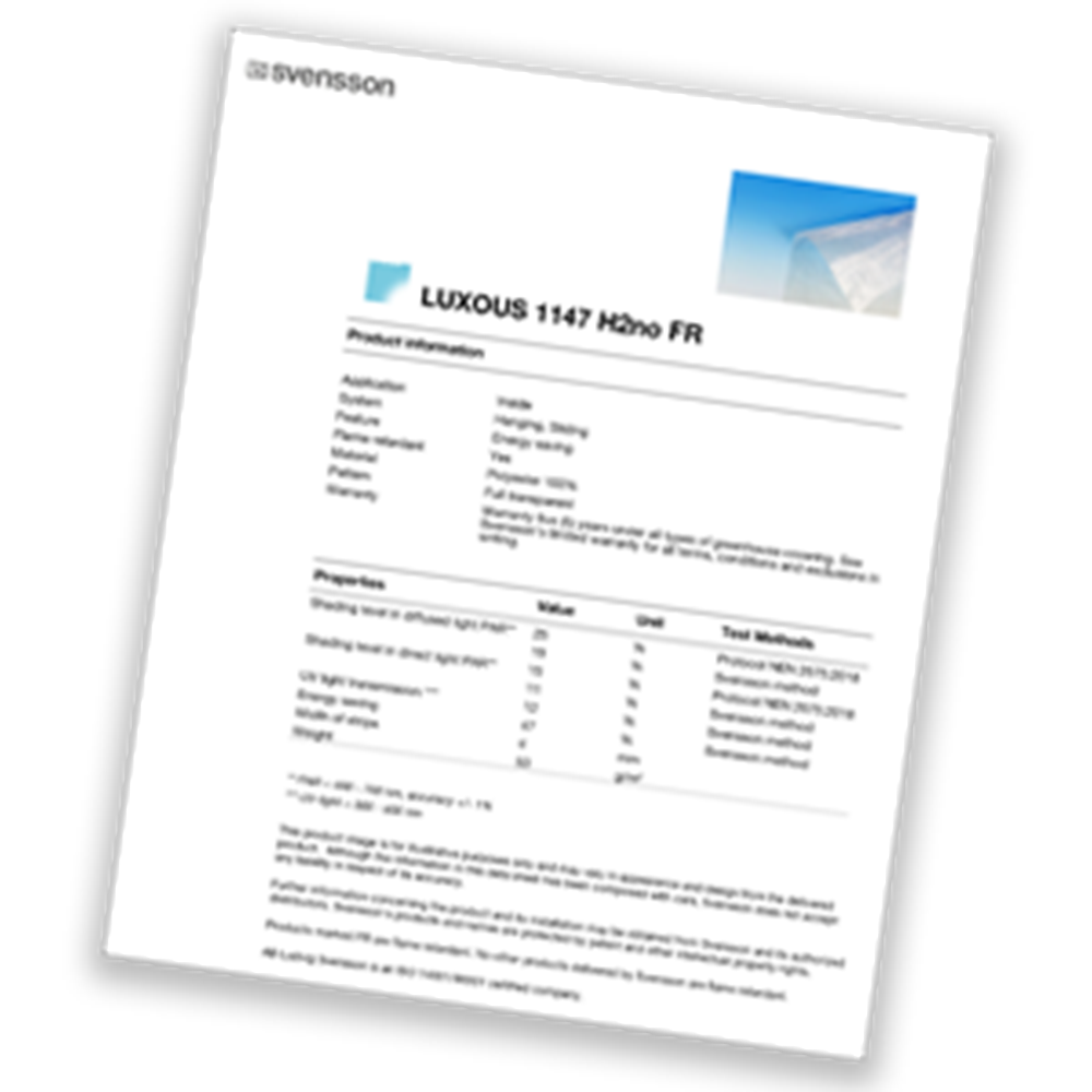 Bei der Entwicklung dieser innovativen Technologie haben wir dafür gesorgt, dass der Schirm mit H2no genauso viel Energie einspart und eine vergleichbar hohe Lichttransmission (im trockenem Zustand) aufweist wie Luxous 1147 FR ohne H2no Technologie.