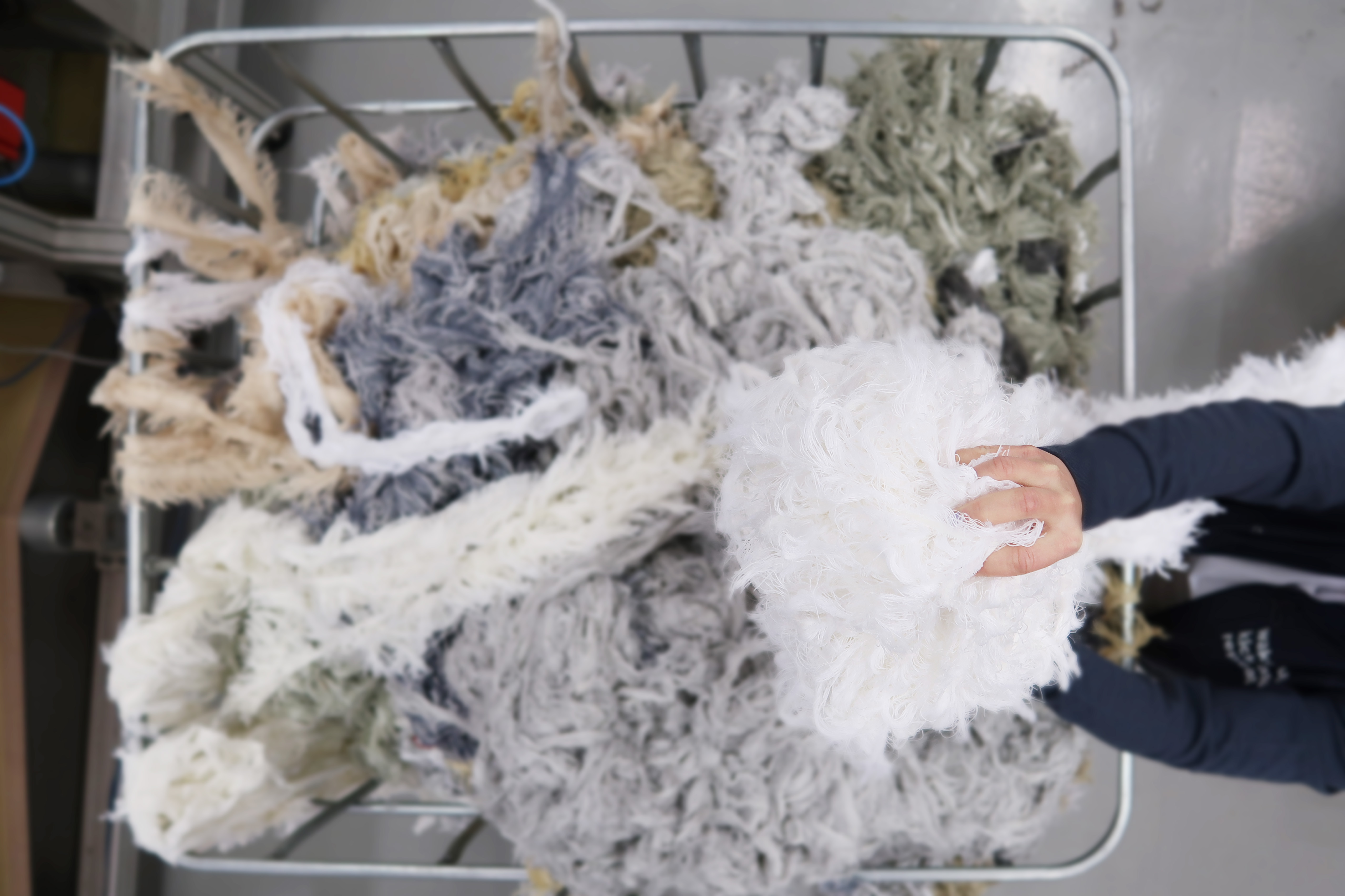 Wenn man Stoff in einem mechanischen Webstuhl webt, wird ein Kantenstreifen erzeugt, der vom fertigen Stoff weggeschnitten wird. Im Durchschnitt sind es je nach Stoffqualität ca. 2-4 Prozent pro laufenden Meter. Es gibt bereits Projekte zur Wiederverwendung von Restprodukten aus Wolle, aber zusammen mit The Loop Factory haben wir ein Recyclingverfahren für Kantenstreifen aus Polyester gefunden.
