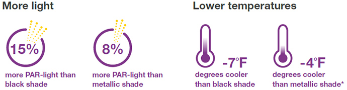 * Results observed in a similar trial at Brite Leaf greenhouse in Florida during summer 2015 showed a 5°F decrease in average temperatures under a 50% Harmony shade compared to a 50% standard metallic shade.