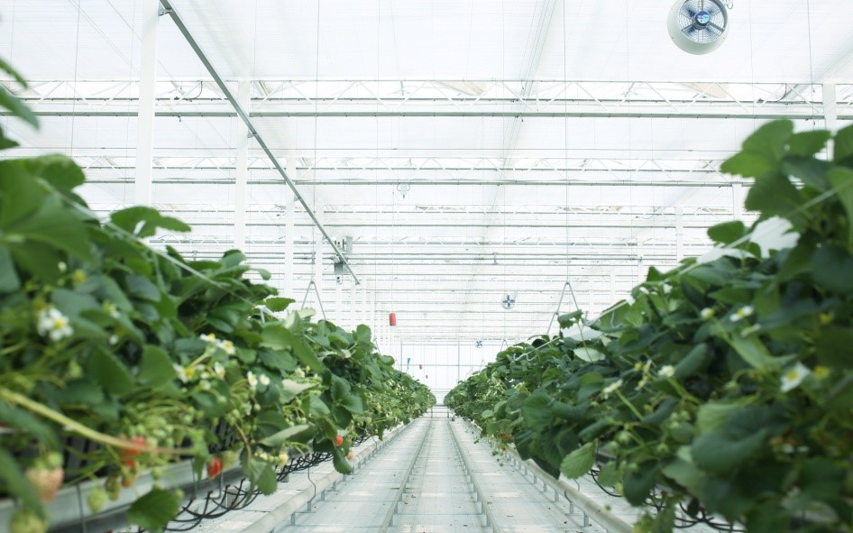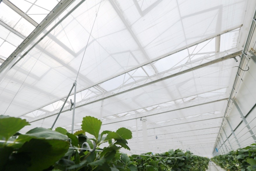 The strawberry production period ends in May. The main cooling method is ventilation and misting. Harmony 3015 O, an open shade screen, was installed below the energy-saving screen as a second layer to increase cooling and benefit from diffuse light.
