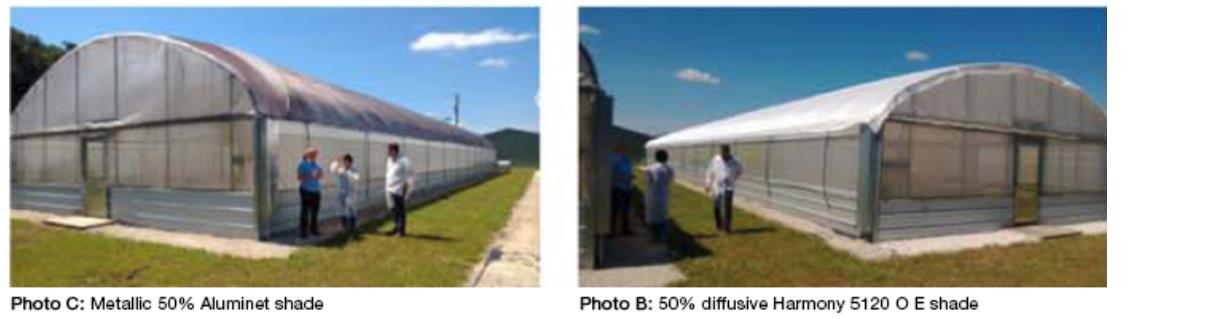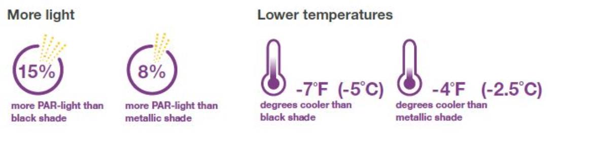 Both studies showed that the greenhouse and enclosures equipped with the open structure white light-diffusing Harmony shades had higher light levels and lower temperatures than the black shade and the metallic shade. Specifically, 15% more PAR-light was recorded than with black shade and 8% more PAR-light than when a metallic Aluminet shade was employed.
