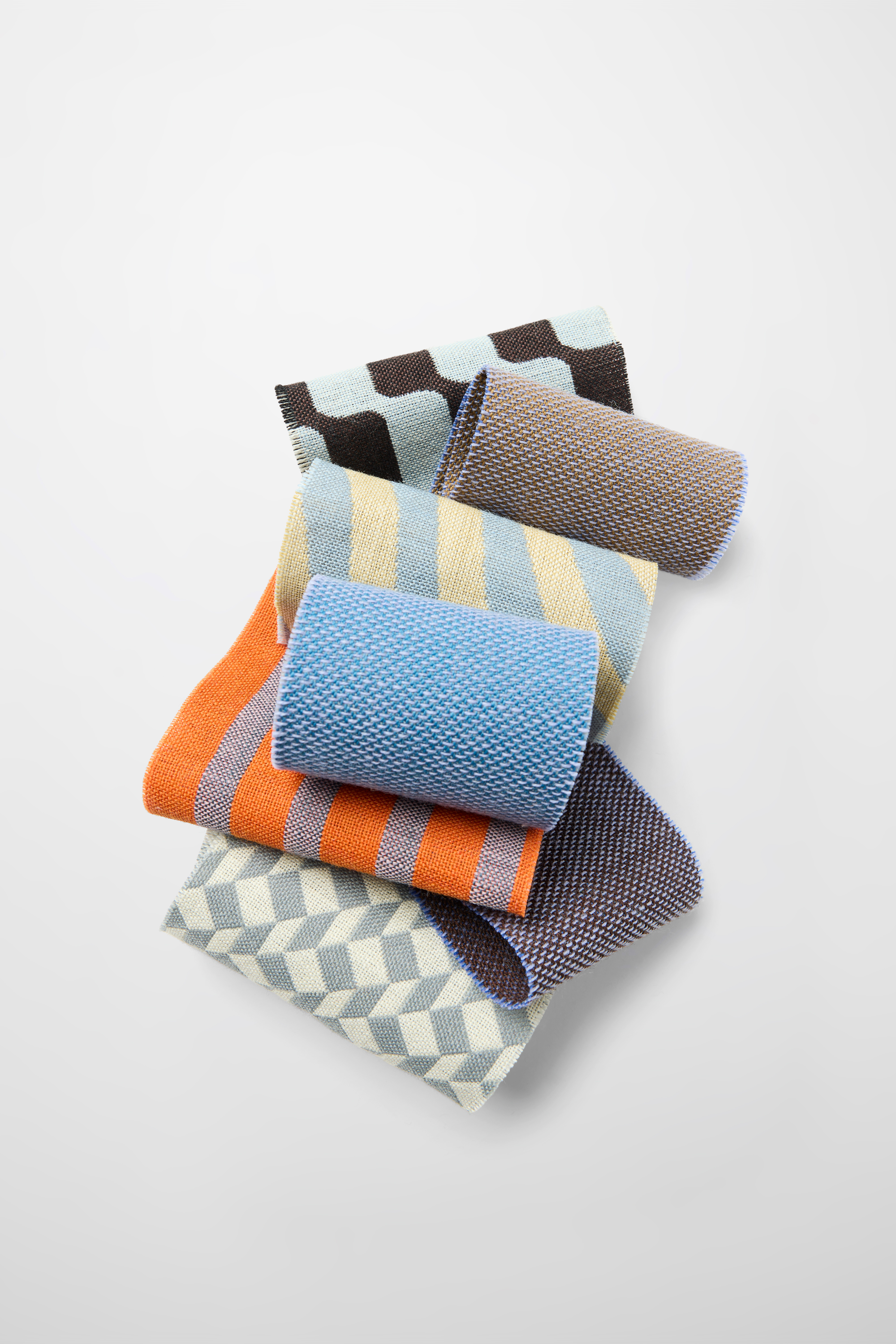 BonBon is a jacquard-woven upholstery fabric concept in wool, featuring six graphic designs united by a single weave construction. Inspired by classic patterns and infused with an artistic sense of rhythm, colour, and scale, BonBon brings a playful touch to interiors. Each of the six patterns has its own identity, yet all are designed to offer something extra.