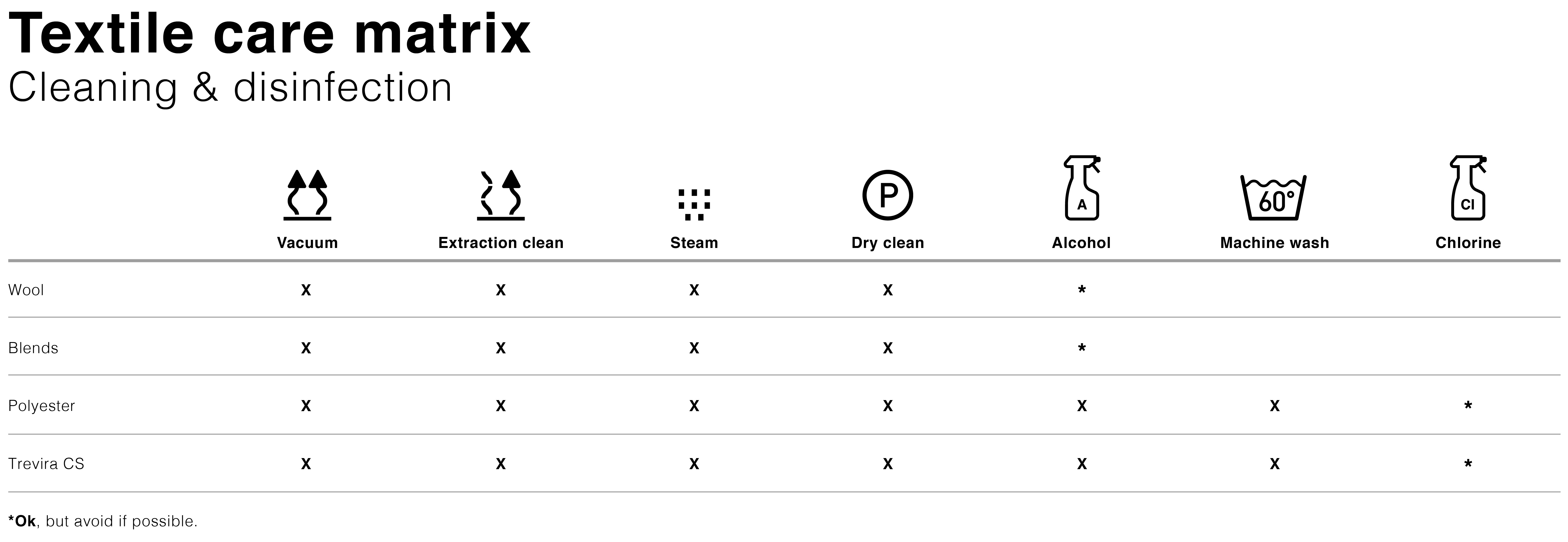 Do not wash woollen textiles and do not clean them using chlorine-based detergents.