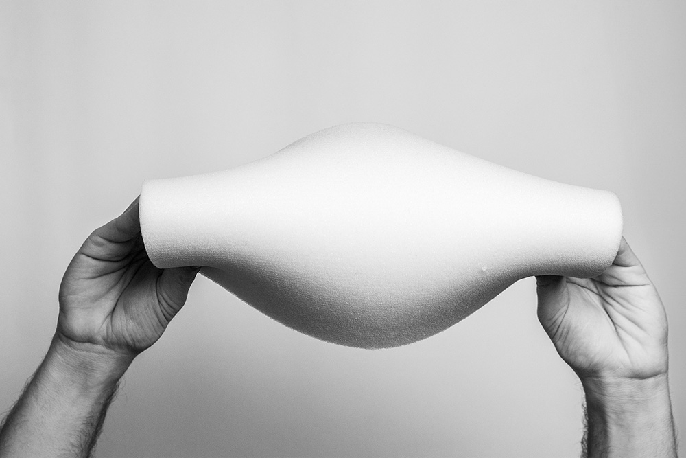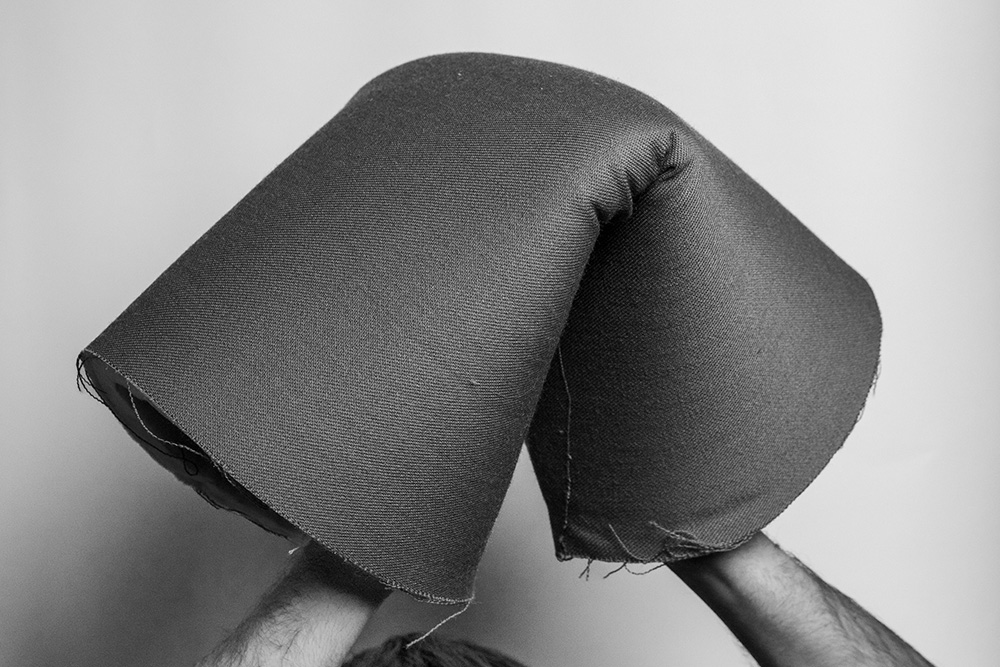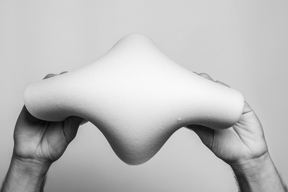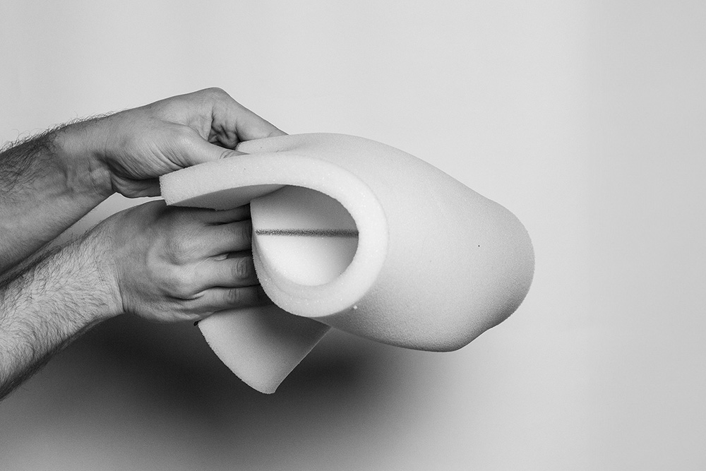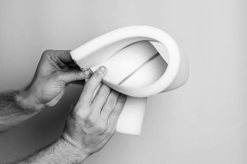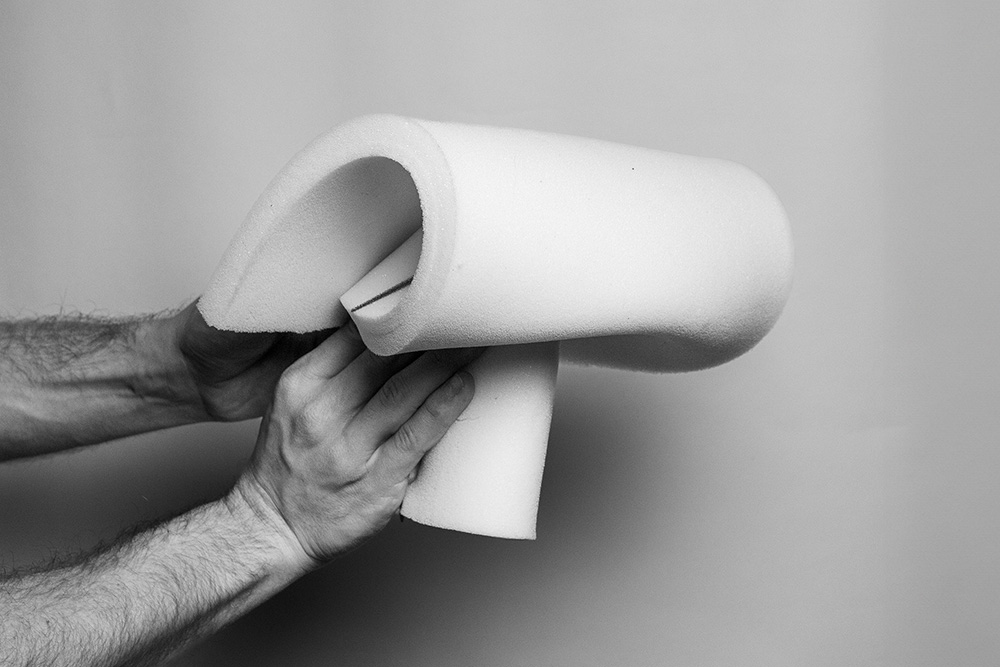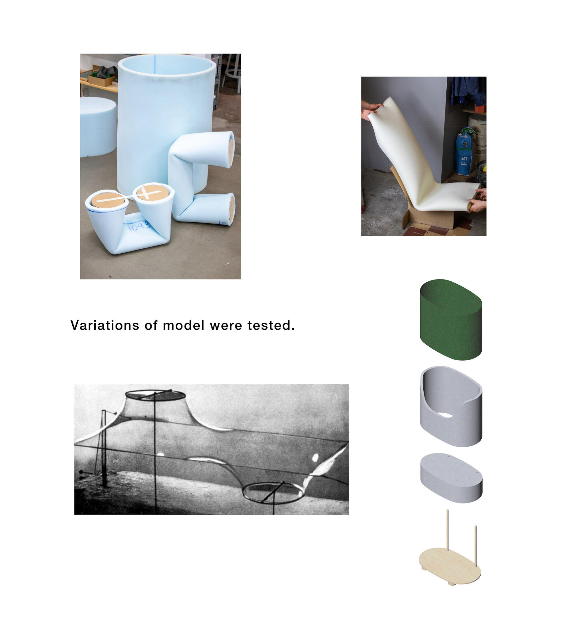 INSPIRED BY THE IDEA OF TEXTILE AS AN EPIDERMAL LAYER WE BEGAN USING FOLDING TECHNIQUES WITH FOAM SHEETS THAT WERE PRESSED INTO 3D DIMENSIONAL FORMS. A TECHINAL FABRIC DEVELOPED BY LUDVIG SVENSSON CALLED EASY ALLOWED US THE FLEXIBILITY, STRETCH AND STRUCTURE WE NEEDED WHEN CREATING THE GEOMETRIES. EASY DESPITE ITS NAME HAS MANY TECHNICAL ABILITIES THAT PERFORM WELL IN COMPLICATED TAILORING NOT TO MENTION THE VIBRANT COLOUR PALETTE. AS THE FORMS EMERGED IT BECAME CLEAR THAT THE PLIABLE DEFORMATIONS COULD BECOME OBJECTS TO SIT ON.