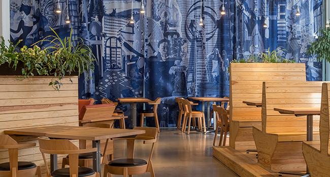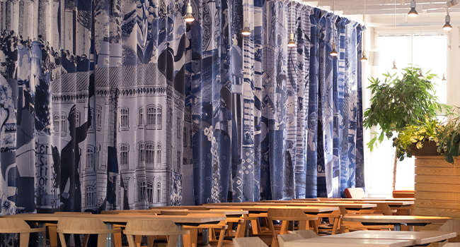 The fabric installation is a work of art for Konstfack's students and visitors to enjoy and it is an honour for Svensson to have developed the fabric at our factory in Kinna. Former Art School students have left an iconic mark through design over the years. A number of these iconic pieces have been used for the detailed drapery, which is now majestically displayed in The Plant's dining room at Konstfack in Stockholm. Such an exciting and aesthetic way to highlight and draw attention to Konstfack's 175 year history.