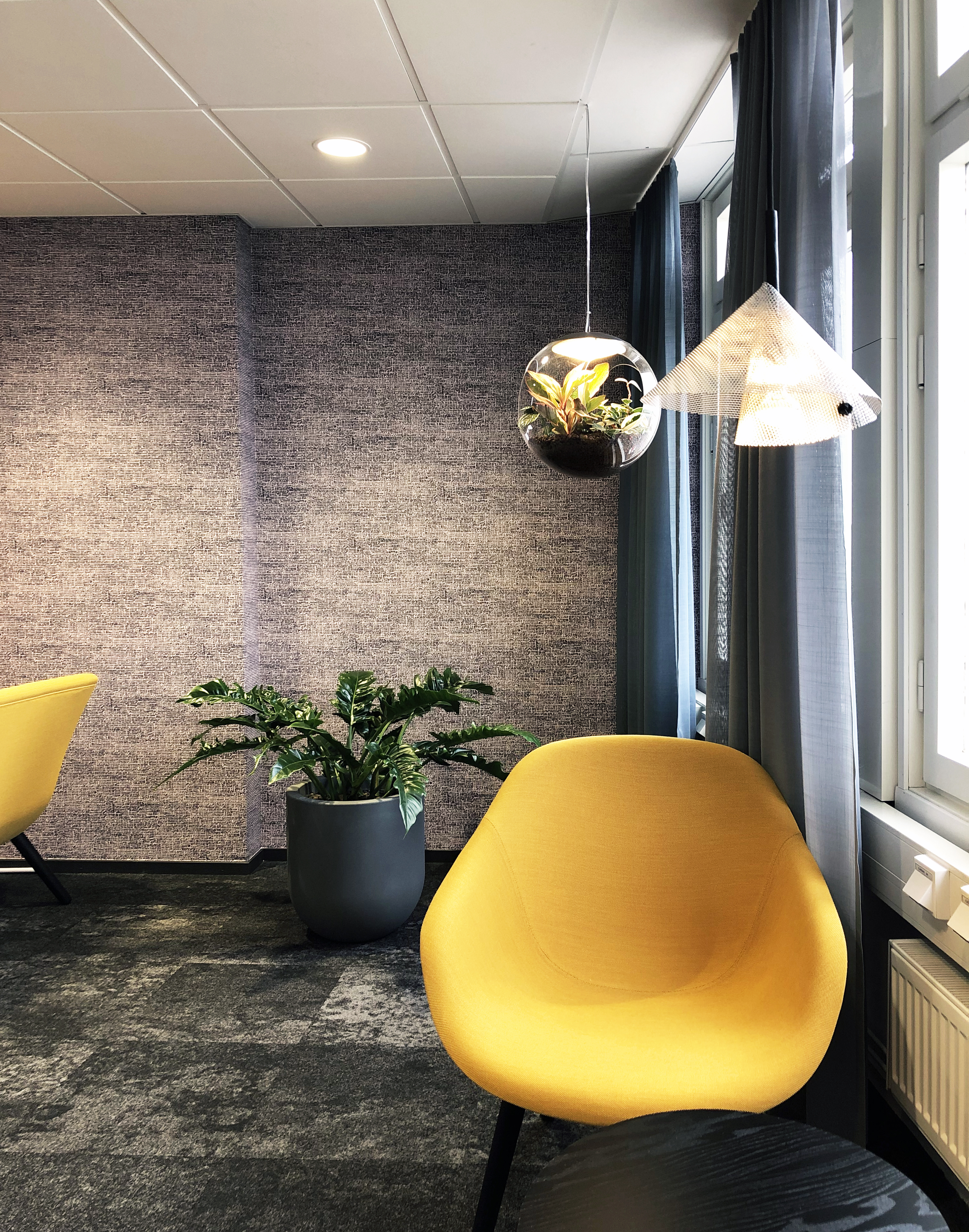 At Solregn there was a desire to add some colour to the office environment and reduce noise. Hanging textiles from Svensson’s Grain collection were part of the solution.
