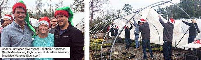 El equipo estadounidense de Svensson donó e instaló pantallas Harmony, Econet y Solarwoven en North Mecklenburg High School esta temporada de fiestas. "No solo tenemos la oportunidad de apoyar a los estudiantes y los programas locales de horticultura a través de nuestras donaciones, sino que también podemos pasar tiempo juntos como equipo voluntario para el bien común", dice Mauricio Manotas, presidente de la oficina de Svensson en América.