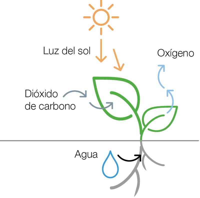 La planta recoge dióxido de carbono del aire, que, junto con el agua, crea hidratos de carbono y oxígeno. Los niveles de dióxido de carbono, temperatura y luz son los factores clave.