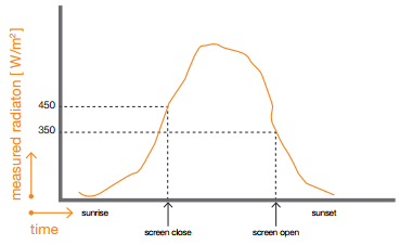 En el ejemplo de la derecha, la pantalla se cierra cuando la radiación solar alcanza 450 W / m2 y se vuelve a abrir por la tarde cuando la radiación cae por debajo de 350 W / m2.
