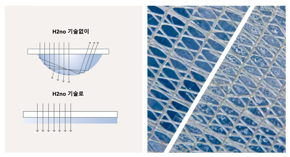 이 혁신적인 기술 개발은 Luxous 1147 FR 스크린의 에너지 절감 및 높은 빛 투과 기능(건조할 때)에 H2no기능을 추가하여 확실한 도움을 줄 수 있는 스크린 제품 개발을 위한 것이었습니다.