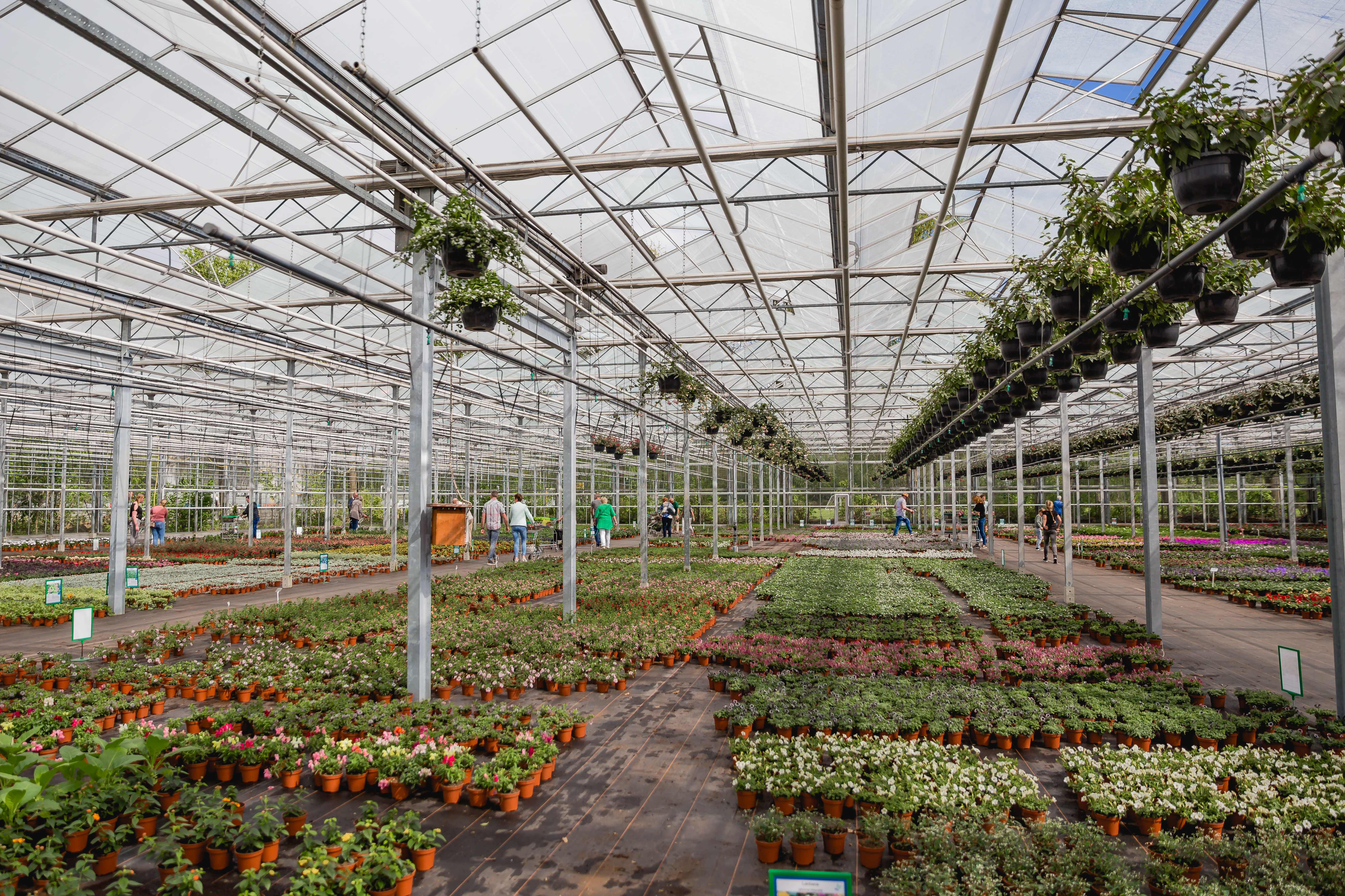 Een dame op leeftijd duwt haar karretje van draadstaal door de kas. Aan de zijkant hangen vier donkergrijze hangpotten met daarin knalblauwe planten. Erboven zet ze planten neer die langs de gangpaden staan. Even later staat ze fier in de rij bij één van de drie kassa’s om haar gekochte planten de parkeerplaats op te duwen. Het is nu rustig, zegt Arno Kuipers. “Goede Vrijdag, dat was pas een goede vrijdag. De hele dag rijen mensen bij de kassa’s.”