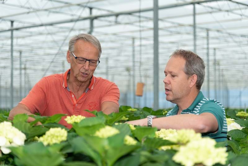 Bart Bakker, klimaatadviseur van Svensson, luistert mee. Twee mensen uit de praktijk die met kennis en kundigheid, volmondig kiezen voor het scherm waarvoor ook hij, als hij Cymbidiumteler zou zijn gebleven, waarschijnlijk gevallen was. Harmony 2315 O FR is het lichtste zomerscherm voor de sierteelt dat er is, en in combinatie met krijten, is het van grote meerwaarde voor het reguleren van temperatuur en licht in de kas. ‘Svensson ontwikkelde dit open Harmony zomerscherm voor telers die een combinatie zochten van zonwering en lichtspreiding voor een betere groei van het gewas. Het zonlicht wordt gelijkmatiger over alle planten en alle delen van de plant verdeeld en dit resulteert in een uniformer, sneller groeiend gewas’, aldus de fabrikant. Wim van der Ende, eigenaar van Tuinbouwadviesbureau Van der Ende, vindt het niks teveel gezegd. Hij ziet de positieve effecten van dit open klimaatscherm dagelijks in de praktijk. “Een evenwichtiger groei, een uniformer gewas, grotere bloemen, een betere kwaliteit”, somt hij de voordelen op. Reden is dat met het scherm het kasklimaat beter in de hand is te houden. Een homogeen klimaat, zonder pieken en dalen, dat is de grote winst die met het nieuwe Harmony te behalen is. In de teelt van rozen, chrysanten en orchideeën wordt de keuze voor het open klimaatscherm in toenemende mate gemaakt. En nu is daar dus Hortensia bij gekomen.