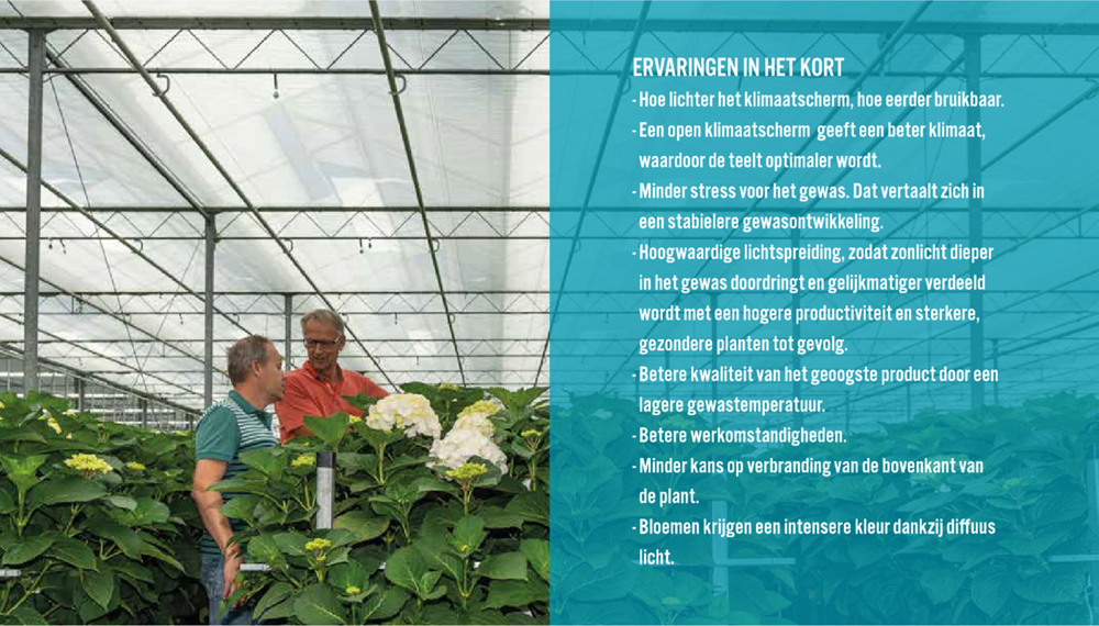 Het zachte silhouet van de luchtramen is zichtbaar op het klimaatscherm, maar op het gewas geen greintje schaduw te bekennen. Nog steeds verwondert het hen. Hortensiakweker Frans Meeuwisse van Steejo, zou het liefst gisteren nog de héle kas van deze open Harmony zomerschermen voorzien en teeltadviseur Wim van der Ende kan zich op dit moment geen beter zomerscherm voorstellen. De diffuse lichtspreiding van het klimaatscherm is een zegen voor de groei en ontwikkeling van het gewas, omdat het meehelpt een stabiel kasklimaat te creëren.