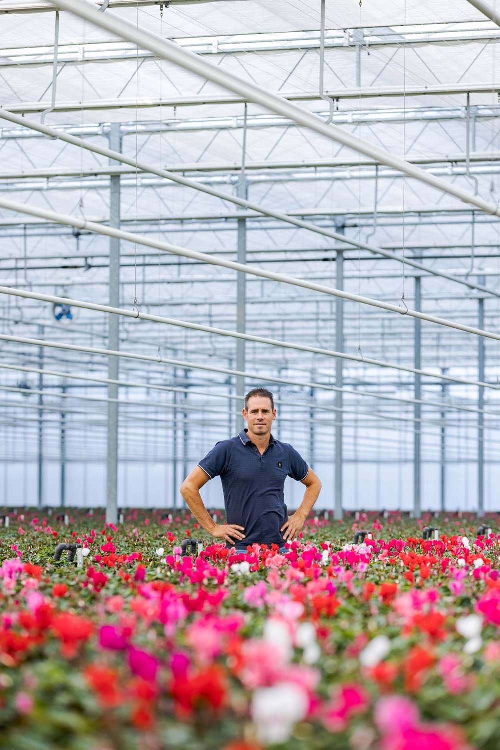 Het is rustig als John de Van Buerenlaan aan de rand van Kwintsheul oversteekt. Hier liet Gebr. Grootscholten zo’n drie jaar geleden een tweede kas neerzetten van 12.000 m2, tegenover de eerste van 4,5 ha. Op de enorme vloer van beton zijn werkers bezig potten met perkgoed met de hand neer te zetten. Op deze zomerse dag is het rustig. “We zijn een 365-dagen bedrijf”, vertelt hij. “We werken volgens de seizoenen. In de maanden maart en april draaien we op volle kracht om het zomergoed op tijd door heel Europa bij de tuincentra te krijgen. Dan staat het hier en ons eerste complex vol. Van onze 6 miljoen planten gaat 85 procent naar het buitenland, zoals Engeland, Frankrijk en Duitsland. We zijn nu bezig voor het najaar en de feestdagen.”