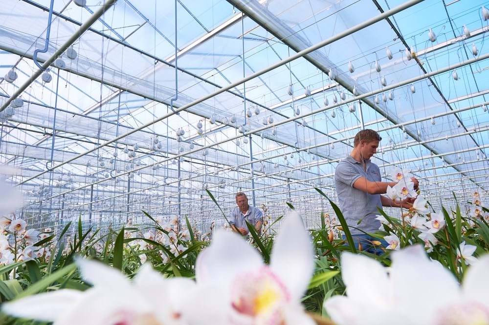 ‘Ga eerst nog maar een paar jaar buiten de deur kijken’, had zijn vader gezegd. Maar een aantal maanden en opdrachten verder ging Frans toch bij zijn vader in het bedrijf aan de slag. “Ik kwam erachter dat ik niet voor een baas wilde werken”, aldus de ondernemende Frans. Samen met zijn vader Aad maakte hij een plan: hoe pakken we het aan? “Mijn vader had alles onder controle met 24 duizend meter. We moesten een stap maken om te voorkomen dat we elkaar aan zouden zitten kijken.” Het plan werd uitbreiden en overstappen op een jaarrond teelt. “Mijn vader draaide bovengemiddeld goed, maar met een kas van gemiddelde grootte en een seizoensteelt cymbidiums was hij niet heel uniek. Daarom de keuze voor een jaarrond teelt.” Daarvoor waren nieuwe technieken en een nieuwe kas nodig. “Een hogere kas met diffuus glas, een hoge druk nevelsysteem en drie schermen van Svensson, waarvan twee binnen en één buiten op de kas.”