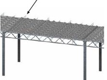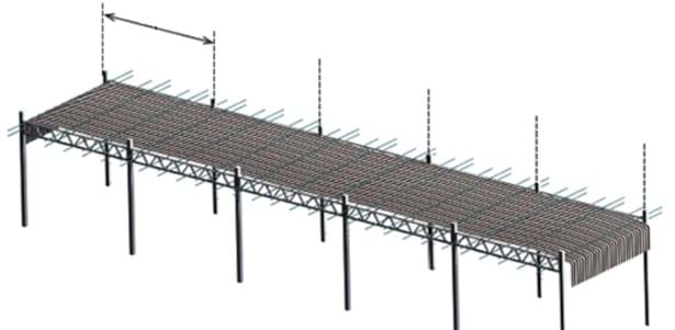 Сначала ровно натяните экран между опорами, а затем добавьте дополнительный материал, распределите его по длине фермы и закрепите. Повторите эту процедуру для каждого пролета. См. рисунок ниже