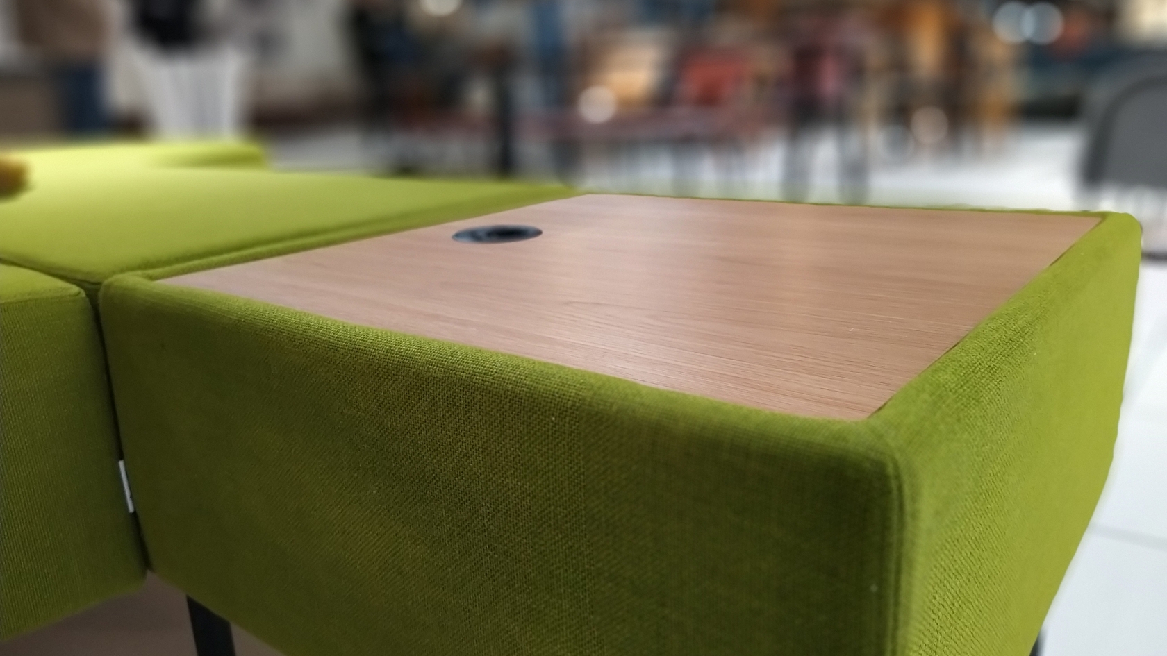 Den ljudabsorberande panelen Snooze, klädd med möbeltyget Semi, förbättrar akustiken och gör rummen behagligare.